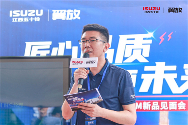 隨后,江西五十鈴汽車銷售有限公司輕卡市場部經(jīng)理鄭洲先生向與會嘉賓詳細介紹了翼放EM的硬核實力,從動力、省油、可靠、承載、安全、舒適等方面介紹了翼放EM的全新特性和產(chǎn)品優(yōu)勢。翼放EM搭載江西五十鈴4JD2發(fā)動機,最大功率達到112kW,最大扭矩達到400N·m,如此強勁的動力,翼放EM傳承了五十鈴輕卡的省油特性,通過五十鈴發(fā)動機技術加持、動力鏈系統(tǒng)的優(yōu)化、全車多項技術創(chuàng)新,油耗在同級產(chǎn)品處于領先水平。翼放EM作為五十鈴高品質輕卡,采用日本五十鈴IMM生產(chǎn)管理系統(tǒng),嚴格的質量管控流程,建立了全球一流的供應商體系,保障產(chǎn)品品質。此外,翼放EM還具備同級領先承載、極致安全和人性化舒適設計等多項產(chǎn)品優(yōu)勢,在滿足廣大輕卡用戶多種使用場景需求的前提下,給予用戶極致的安全呵護和舒適的駕乘感受。