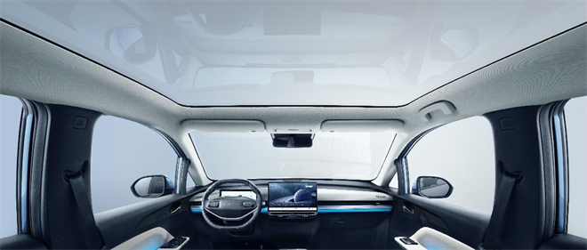 前擋風玻璃與全景天幕車頂無縫連接,形成“星鏡無界”一體式穹頂,猶如一整塊光潔深邃鏡面映照著璀璨星空,為科技感設計融入浪漫詩意。