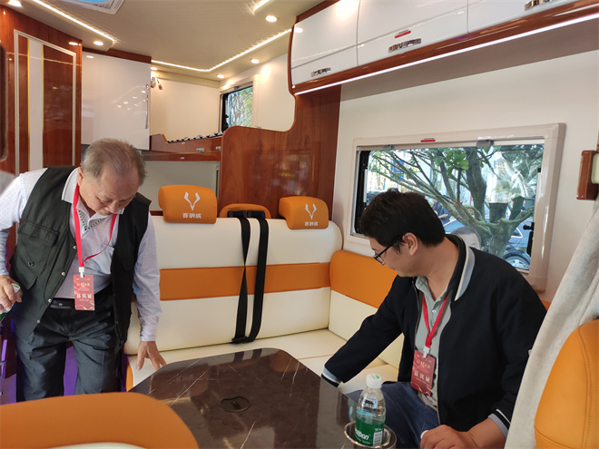 據現場介紹,賽吶威新品房車采用品牌江鈴福特底盤,自動變速箱,駕駛性能優越,外觀設計突出干凈利落的現代感,在大額頭上創新使用正面超180°環形窗幕設計,打破市場其它車型額頭床空間逼仄、體驗欠佳的痛點問題,是賽吶威房車設計的差異化亮點,車尾兩側一字縱列組合尾燈,也是其利落現代感的設計體現。其房車內部設計注重空間的極致利用和居住的舒適性,將睡眠、會客、衛生、餐廚等生活空間動線打通,讓車上共享走動空間寬敞合理。上、中、下三層級立面空間收納系統收納柜,讓物品各有所歸,解決長期旅行置物困擾。舒適性方面,采用航空座椅靈活舒適、定制舒適床墊等。賽吶威房車還采用無梯上床的新式集成設計和頂裝太陽能光伏板的可持續節能設計,旨在為消費者提供更多旅途便利。