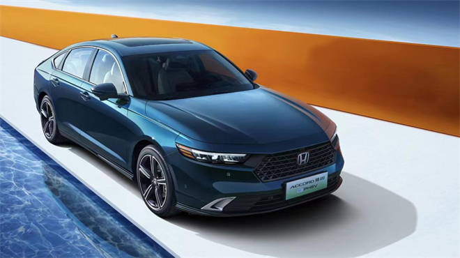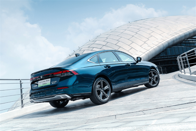 雅閣e:PHEV車型同樣是經典家族式設計,延續了過去車型的風格,整體運動感稍強,前臉造型較為圓潤,車身線條感較弱,兩側大燈也呈現出圓潤立體感覺,與燃油版相比,外觀幾乎與其保持一致,沒有太大變化。