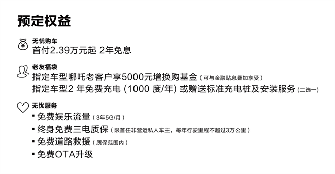 更讓用戶驚喜的是,除了低首付、2年免息的實惠外,2024款哪吒S還將誠意拉滿:用戶不但可以享受到8,000元金融貼息或者增換購補貼,哪吒老客戶還可專享5,000元增換購基金,以及2年免費充電(1,000度/年)或贈送標準充電樁及安裝服務;此外,3年5G/月的免費娛樂流量、終身免費的三電質保、免費道路救援和免費OTA升級將進一步為用戶的無憂出行提供服務支持。