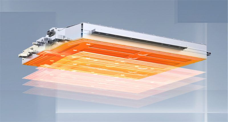 為解決這一問題,動力電池為PTC加熱片供電,PTC加熱片生熱并加熱冷媒,然后將熱量從冷板、導熱墊和模組底面傳遞至電芯,不僅實現電池的快速升溫,還在低溫環境下幫助電池順利充電、保護電池并延長電池使用壽命。