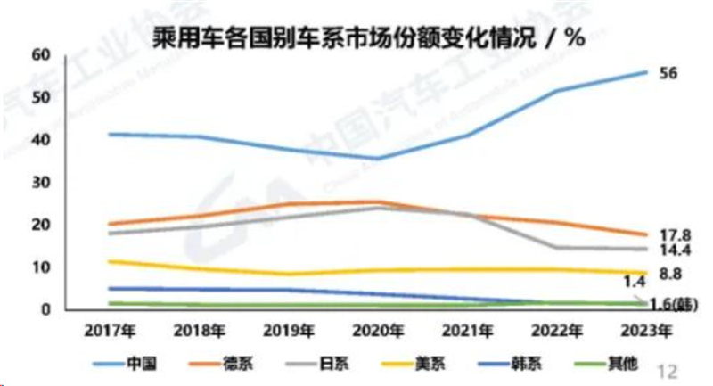 據(jù)中國汽車工業(yè)協(xié)會統(tǒng)計的數(shù)據(jù)顯示,2023年中國乘用車銷量為2192.3萬輛,同比增長4.2%,其中中國品牌乘用車銷量為1459.6萬輛,同比增長24.1%,市場份額高達56%,比2022年上升了6.1個百分點。與此同時,合資品牌乘用車市場份額不斷被蠶食,德系和日系從之前的20%以上下滑到15%左右,韓系甚至跌落到1.6%,法系則更低。