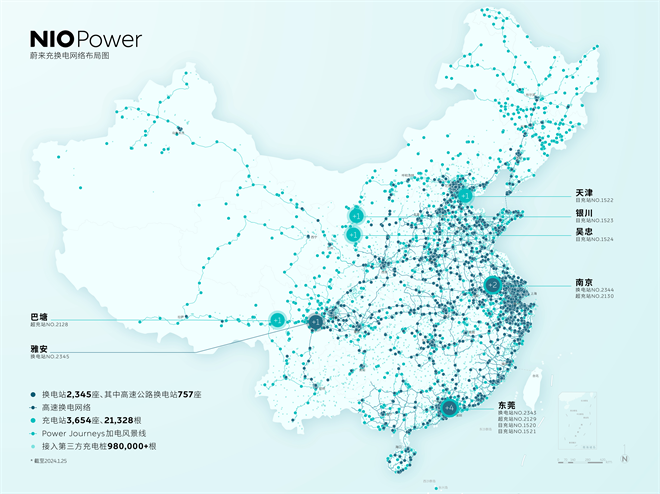 “讓加電比加油更方便”。截至1月25日,蔚來已經在全國布局換電站2,345座,其中高速公路換電站757座,打通7縱6橫11大城市群高速換電網絡,布局充電站3,654座21,328根,三方樁980,000+根,為用戶提供可充可換可升級的能源服務體驗。