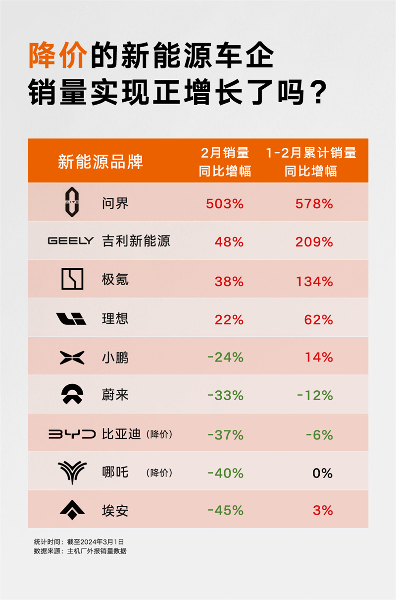 傳統(tǒng)車企競(jìng)爭(zhēng)同樣焦灼。比亞迪雖然憑借超300萬(wàn)輛的銷量,成為2023年國(guó)內(nèi)汽車市場(chǎng)銷冠,不過(guò)在今年1月,其銷量卻被吉利汽車以11994輛車的明顯優(yōu)勢(shì)超越。單看2月新能源最新銷量,比亞迪雖然早在新年開(kāi)工后就祭出價(jià)格殺器,不過(guò)仍然難逃同環(huán)比負(fù)增長(zhǎng)的慘淡結(jié)果,廣汽埃安同比下降更是高達(dá)44.6%。而吉利汽車新能源2月銷量33508輛,同比勁增高達(dá)48%,在甩開(kāi)一眾對(duì)手的同時(shí),新能源全面加速向新。