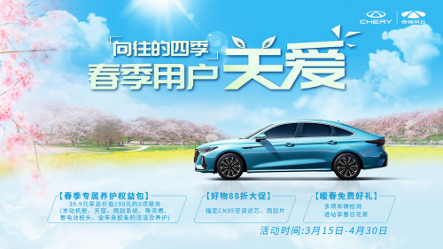 3月氣溫逐漸回暖,又到了出門春游踏青的好時節(jié)。始終以用戶為中心的奇瑞,以實力寵粉,特別為用戶推出向往的四季-春季用戶關(guān)愛活動,其中包含多項活動權(quán)益,助力車主朋友暢享春天的美好心情?;顒佑行跒?月15日-4月30日,長達(dá)一個半月,快來一起看看吧!
