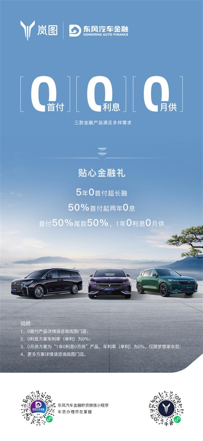 【2024年4月12日,武漢】近日,中國人民銀行、國家金融監督管理總局聯合印發《關于調整汽車貸款有關政策的通知》,調整汽車貸款最高發放比例,促進汽車消費。作為高端新能源“國家隊”,嵐圖汽車率先響應,推出了一系列全新金融政策,包括0息、0首付、0月供等,為不同消費習慣和消費能力的人群提供了多元化金融解決方案,旨在讓換購用戶可以更低成本實現置換需求,同時也讓更多用戶更輕松實現購車夢想。