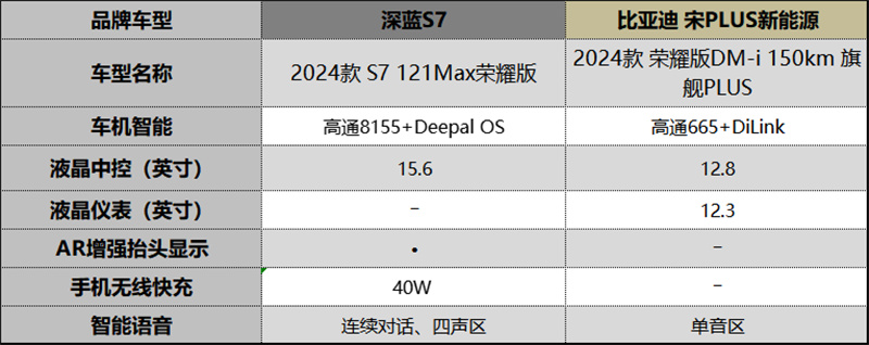 在核心車機配置上,深藍S7采用了高通驍龍8155芯片和Deepal OS車機系統,其高達105K DMIPS的算力遠超宋PLUS DM-i的8G運行內存、基于高通665芯片和DiLink車機系統的配置。這意味著深藍S7在運算反應速度上更為迅捷,為用戶帶來更加流暢、高效的智能體驗。不僅如此,深藍S7還配備了宋PLUS DM-i所不具備的40W手機無線快充和AR-HUD增強抬頭顯示等先進功能。這些實用且科技感滿滿的功能不僅提升了用戶的用車體驗,還展現了深藍S7在智能科技方面的領先地位。雖然兩款車型均支持語音操控功能,但深藍S7的四聲區智能語音系統更勝一籌。無論用戶坐在車內的哪個位置,都能與車機進行無障礙的交流,享受更加徹底、沉浸式的智能操控體驗。這種全面的智能交互能力,無疑為駕駛者帶來了更加便捷、智能的駕駛享受。