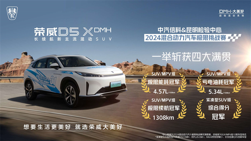 當前,國內混動技術百花齊放,新能源市場的關注焦點也逐漸從純電轉移至混動車型,混動技術角逐已進入下半場。5月25日,2024混合動力汽車極限挑戰賽于新疆最美景觀大道——“獨庫公路”盛大啟幕,“長續航新主流混動SUV”榮威D5X DMH以“六邊形戰士”的全方位性能實力戰勝比亞迪宋PLUS DM-i、長安啟源Q05、RAV4榮放雙擎E+等強勁對手,力摘緊湊型SUV組別冠軍,并在虧電油耗、極限續航、極限能耗三大測試維度中,均取得SUV/MPV組別冠軍,一舉斬獲四大滿貫。