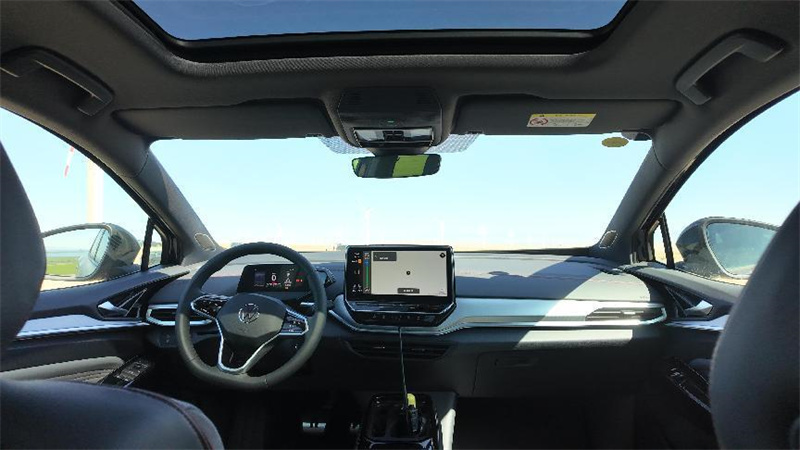 經(jīng)過風車田時,那些巍峨的風車在微風中輕輕轉(zhuǎn)動,它們巨大的葉片在空中劃出優(yōu)美的弧線,與ID.4 CROZZ那動感十足的身姿共同繪成了一幅美麗的畫卷。此刻,我深切體會到了ID.4 CROZZ內(nèi)飾的精巧與舒適。2024款ID.4 CROZZ儀表板上的INS透光飾條,在光線的照耀下散發(fā)出柔和的光芒,不僅提升了內(nèi)飾的時尚感和現(xiàn)代氣息,還增添了空間的層次感,為駕駛艙營造出了獨特的氛圍,仿佛每一處細節(jié)都在訴說著匠心獨運的故事。而新款ID.4 CROZZ PURE+版的三幅式多功能方向盤,采用超纖材質(zhì)打造,手感細膩且耐磨,如同握住了未來的脈搏,讓駕駛更加愜意且操控自如。我輕輕轉(zhuǎn)動著方向盤,感受著它行駛在戈壁灘上帶來的每一寸反饋,心中不禁涌起一股難以言喻的滿足感。