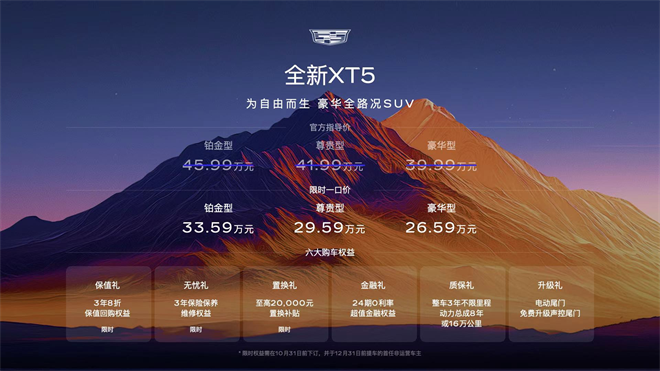 城市游俠們,注意啦!凱迪拉克全新XT5 限時(shí)一口價(jià) 26.59 萬元 -33.59 萬元,錯(cuò)過這次你可能要等上一年!