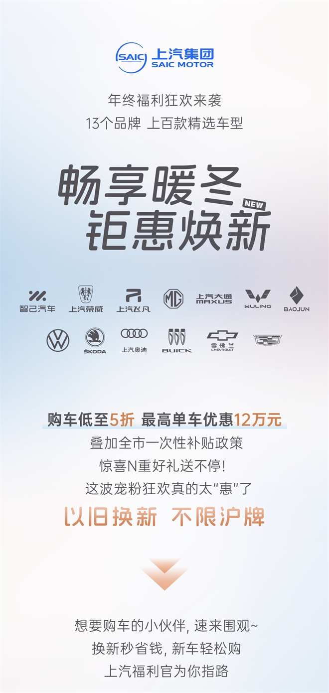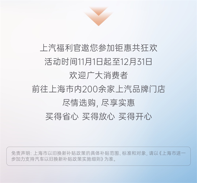 (2024年11月1日,上海)為了進一步推動消費品“以舊換新”,助力“中國國際消費中心城市精品消費月”活動,今天上海市正式發布新的汽車領域以舊換新消費政策。至2024年12月31日,消費者在上海通過舊車置換購買純電動車或燃油車,符合特定條件的情況下可享受政府一次性1.5萬元或1.2萬元補貼,均不限滬牌(具體補貼范圍、標準和對象,請參見《上海市進一步加力支持汽車以舊換新補貼政策實施細則》)。上汽集團積極響應政策號召,同樣以真金白銀回饋廣大消費者,提振消費信心、點燃消費熱情。十三個品牌、上百款精選車型,最高優惠可達12萬、低至五折,誠邀您蒞臨“2024上海汽車消費嘉年華”!歡迎廣大消費者前往上海市內 200 余家上汽品牌門店,盡情選購、盡享實惠。