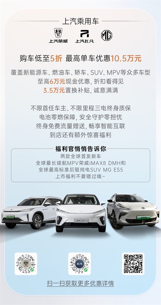 13個品牌百余款車,陣容龐大。此次活動,上汽集合旗下智己、榮威、飛凡、MG、大通、五菱、寶駿、奧迪、大眾、斯柯達、凱迪拉克、別克、雪佛蘭13個整車品牌的百余款車型,以創新產品、優質服務、貼心價格回饋廣大消費者,積極響應上海市“以舊換新、不限滬牌”等全新促消費政策,推動汽車消費持續升溫。