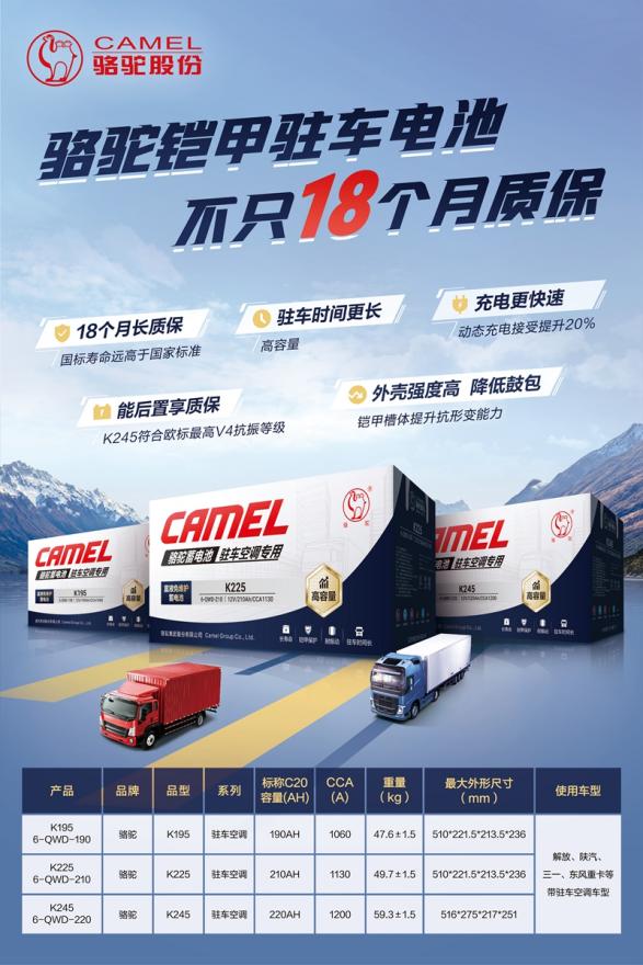 深耕蓄電池行業40多年的駱駝,憑借其在駐車電池領域的技術積淀,針對駐車時長、充電速度、耐振動、抗形變、長壽命等五大核心性能進行了全新升級。駱駝鎧甲駐車電池與一汽解放、陜汽重卡、東風重卡等知名品牌的重型卡車車型高度適配,輕松滿足現代物流行業對高效電力的需求。同時,K系列駱駝鎧甲駐車電池的質保期已提升至18個月,為卡友們提供更加安心的使用保障。