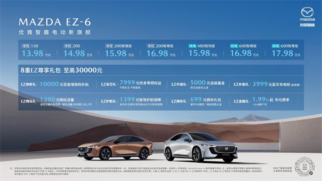 為了讓更多的消費(fèi)者能夠體驗(yàn)到MAZDA EZ-6的魅力,長(zhǎng)安馬自達(dá)推出了超低起售價(jià)13.98萬元,以及高達(dá)30,000元的購(gòu)車權(quán)益。購(gòu)買EZ-6的用戶還可以享受8重EZ尊享禮包,包括增換購(gòu)補(bǔ)貼、終身零燃權(quán)益、選裝基金、藍(lán)牙充電樁等多重優(yōu)惠。