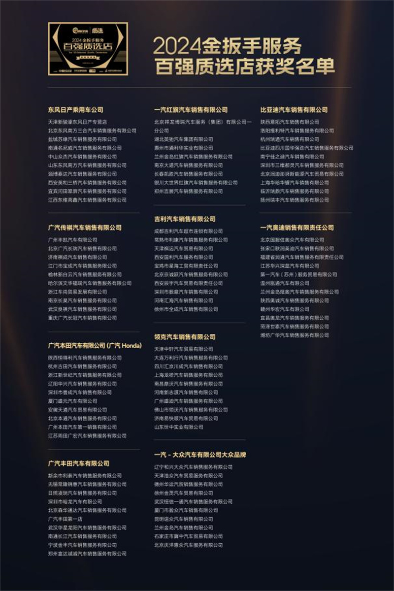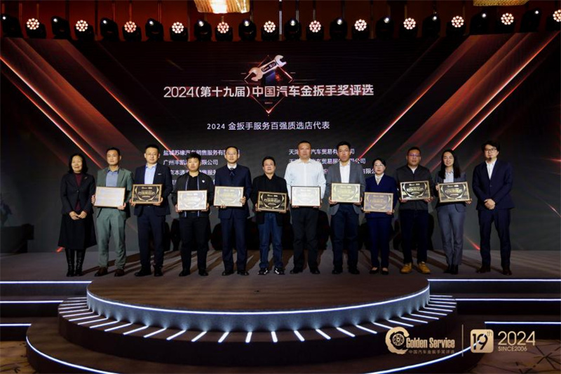 為了樹立品牌服務標桿榜樣,助力提升汽車服務質量,促進良好市場環境,主辦方同期舉辦了2024金扳手服務百強質選店評選活動,該評選由中國汽車維修行業協會指導,依據金扳手GES-150服務評價標準和《放心汽修認證》團體標準,對候選經銷商進行專業評審,最終共有10個品牌的全國100家優秀經銷商獲得“2024金扳手服務百強質選店”榮譽稱號,他們代表了行業頂級水準的“金扳手”服務。