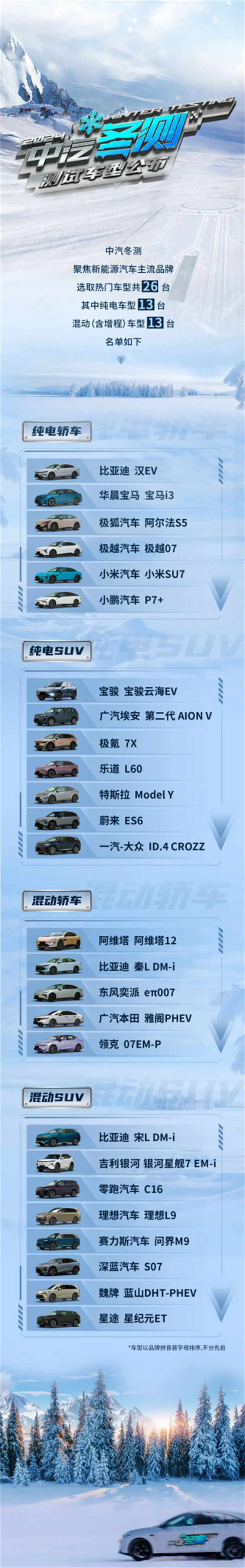 近日,中汽冬測公布了測試車型名單,根據名單列表我們可以看到,共有26臺熱門車型參與到本次中汽冬測中,其中純電車13臺,混動(含增程)車型13臺,包括市場上熱門的比亞迪 漢EV、小米SU7、特斯拉Model Y、阿維塔12、問界M9、深藍汽車S07等。這些新能源車型涵蓋了市場上的主流選擇,主辦方將通過廣泛的車型覆蓋、科學的選車原則以及統一規范的車輛獲取方式,為消費者提供在極端寒冷條件下車輛真實性能的重要參考。