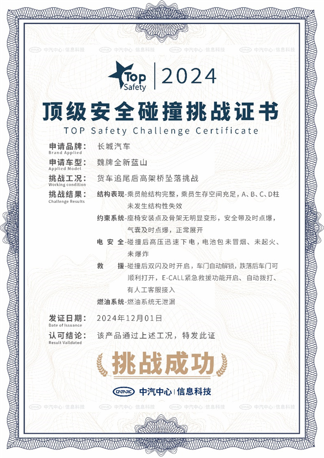 2024年12月2日-4日,在第13個全國交通安全日之際,作為長城汽車旗下高端新能源品牌,魏牌攜手中汽中心TOP Safety開展了一場難度極大的“行業(yè)首個高架橋墜落挑戰(zhàn)”。作為此次挑戰(zhàn)的主角,魏牌全新藍山以卓越的整車、電池、主被動、智駕等安全性能,成功通過這一極限測試,再次印證了其在安全領(lǐng)域的強勁實力和領(lǐng)先地位。