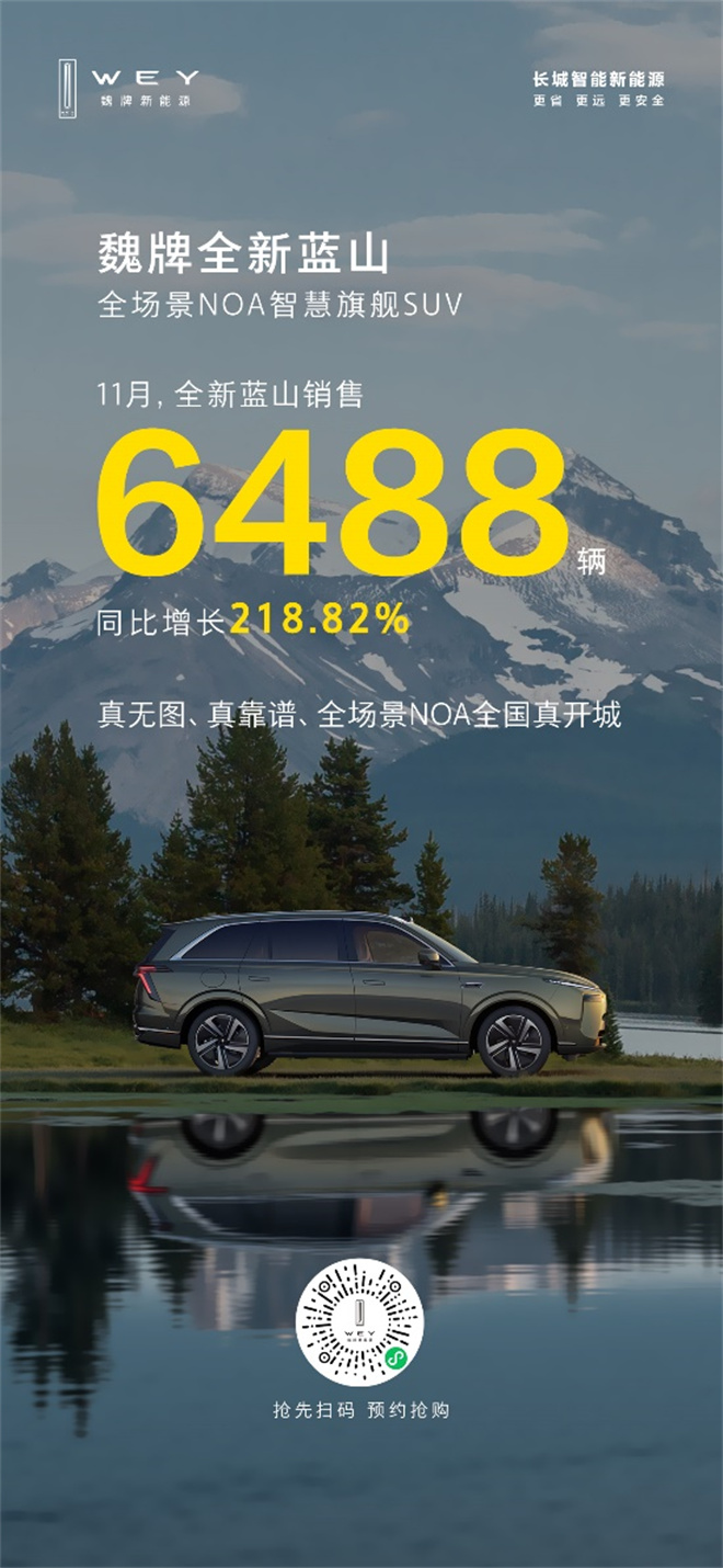 憑借全面卓越的硬核實力,全新藍山以頭部優(yōu)等生的姿態(tài)披荊斬棘,持續(xù)贏得市場與用戶的廣泛認可與信賴,引領(lǐng)了大六座新能源SUV市場的發(fā)展方向。據(jù)最新銷量數(shù)據(jù)顯示,魏牌全新藍山11月銷售6488輛,同比增長218.82%,保持強勁增勢,不斷綻放中國智造高端實力的“魏牌風采”。