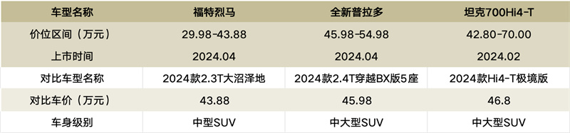 綜合來看,全新普拉多在品牌口碑、越野性能和市場關注度等方面表現突出,坦克700Hi4-T在動力、空間和科技配置上具有優勢,福特烈馬則在外觀和空間上有一定的特點,但品牌認可度、市場定位等方面存在不足。