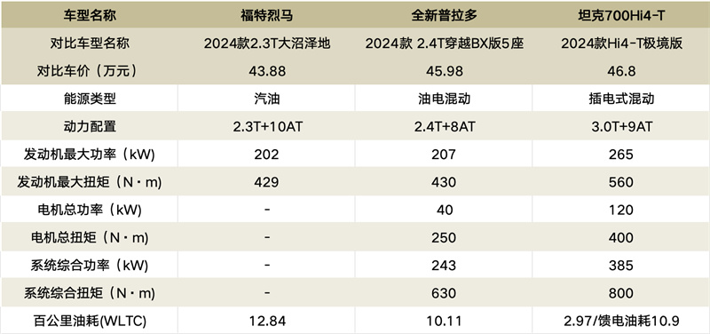 對于一款硬派越野SUV而言,「靜態」的造型體格、科技配置都是附加值,動力操控和底盤調校等「動態」性能才是最硬核的。而面對三款動力類型各不相同的車型(福特烈馬為傳統汽油車,全新普拉多、坦克700分別是油電、插電式混動車),我們可以直觀地看到哪種動力最具爆發力。
