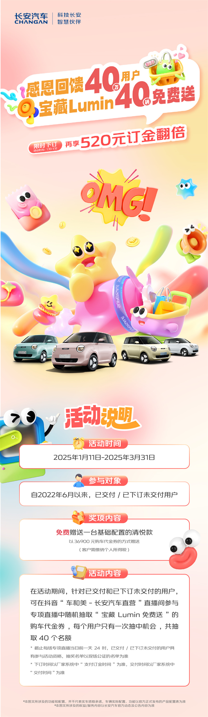 值得一提的是,首場直播僅是“感恩回饋40萬用戶”活動的開端。接下來,長安汽車將在2025年2月-3月內舉辦剩余3場直播抽獎活動,剩余的30臺寶藏Lumin將陸續送出。此外,1月10日-1月12日下訂的用戶還能享受520元訂金翻倍,新年開新車購車更輕松。
