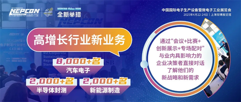NEPCON China 2025力求為三大高增長行業搭建起內外溝通與合作的橋梁,通過采取“展示+會議+競賽+專場對接”這一綜合化的運作模式,開展汽車電子、半導體封測、新能源制造三大主題活動,屆時將吸引8,000名汽車電子行業、2,000名半導體封測行業以及2,000名新能源制造行業的專業觀眾,為行業精英呈現新標準、新技術、新趨勢,深入洞察其新戰略導向與市場需求。