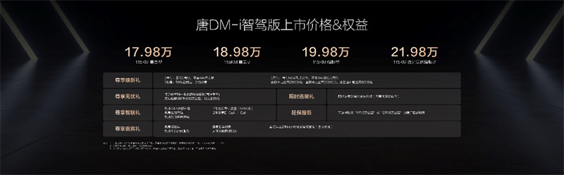 此次,唐DM-i智駕版共推出4款車型,售價17.98萬~21.98萬元,真正實現加配不加價。同時,比亞迪為用戶準備了包括“尊享煥新禮、尊享無憂禮、尊享貴賓禮、尊享智聯禮、限時選裝禮、延保服務”六重購車禮遇。