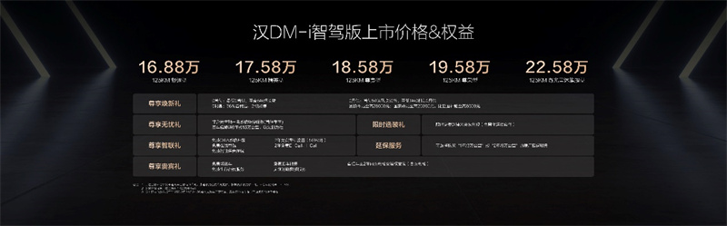 其中,漢DM-i智駕版共推出5款車型,售價16.88萬~22.58萬元;漢EV智駕版共推出5款車型,售價17.98萬~23.58萬元,開創(chuàng)B+C級轎車全民智駕,加配不加價!