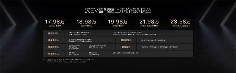 同時,漢智駕版還為用戶準備了包括“尊享煥新禮、尊享無憂禮、尊享貴賓禮、尊享智聯(lián)禮、限時選裝禮、延保服務(wù)”六重購車禮遇。