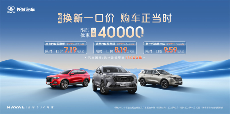 而在這次一口價中,哈弗H6系列車型率先亮劍,以品牌鉅惠打底,疊加專屬車型權(quán)益,將 "一口價" 的誠意精準投射到每個細分需求,只為讓用戶“值的買、放心買、買得值”。其中,新一代哈弗H6限時一口價9.59萬起,享金融禮、保養(yǎng)禮及終身智控服務及OTA升級,智駕體驗一步到位;2025款哈弗H6國潮版限時一口價7.19萬起,至高5萬24期0息,讓你購車0壓力,另有首任車主(非營運、非公戶)發(fā)動機、變速器核心部件終身質(zhì)保+基礎流量終身免費,兼顧經(jīng)濟性與科技感;哈弗H6經(jīng)典版限時一口價8.19萬起,首任車主(非營運、非公戶)發(fā)動機、變速器核心零部件終身質(zhì)保+娛樂流量3年暢享;這一波福利可以說把質(zhì)價比直接抬到了天花板。