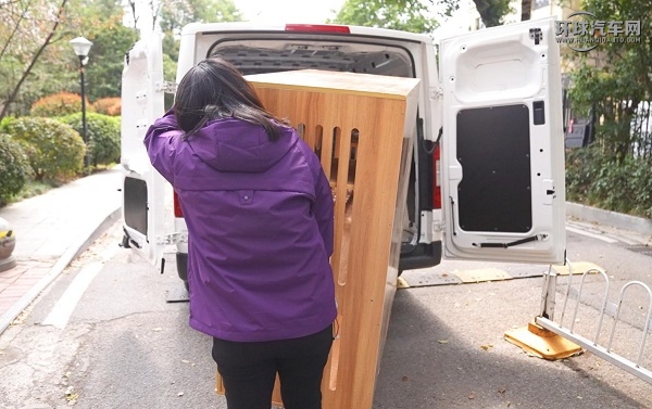 第二單貨有點“奇葩”,是個養貓用的小木屋,也稱“貓別墅”(城區工況)。這物件重量不大但是體積較大,高度達到一米二。前面開小面的師傅都因為裝不下把訂單取消了,貨主有心忍痛叫個4米2的廂貨,但又覺得不值。得益于一體化承載車身的低地板設計,樂福的貨艙內部凈高度達到了一米四五,而離地間隙并沒有受到影響,侯女生輕松接下了這單。