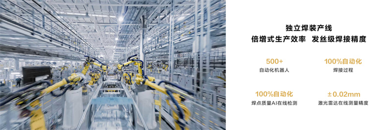 賽力斯超級(jí)工廠焊裝車(chē)間,應(yīng)用超過(guò)500臺(tái)自動(dòng)化機(jī)器人,實(shí)現(xiàn)焊接過(guò)程100%自動(dòng)化、焊點(diǎn)質(zhì)量AI在線檢測(cè)100%自動(dòng)化,生產(chǎn)效率倍增;同時(shí),工廠還引進(jìn)了激光雷達(dá)在線測(cè)量,測(cè)量精度可控制在±0.02mm,實(shí)現(xiàn)頭發(fā)絲級(jí)焊接精度。