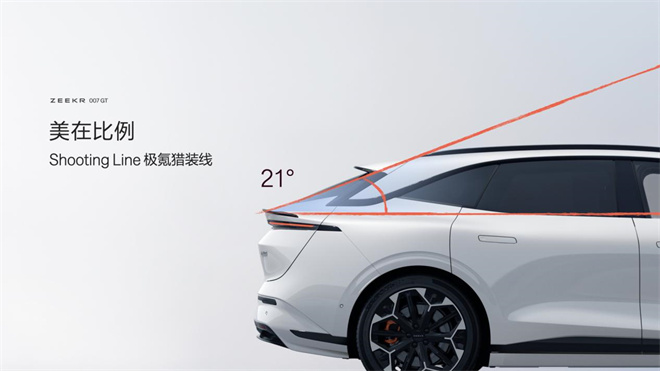 極氪007GT,美在比例。原創Shooting Line極氪獵裝線,線條夾角鎖定為21°,兼具姿態美、風阻低、空間大,是功能與美學結合的黃金線。夾角過大,整車設計將變得更加中庸方正,更接近傳統旅行車。夾角過小,設計將更接近溜背車,第二排和后備廂空間都受到影響。