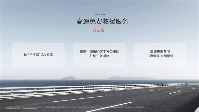 豪華服務,要有引領行業的服務體驗。極氪提供全系車型“三電不限里程終身質保”,行業唯一,并在全行業率先取消關于長期停放的全部免責條款。極氪提供高速免費救援服務,行業唯一。新車4年或10萬公里內免費道路救援,覆蓋全國任何道路,高速拖車費用不限里程全額報銷,行業唯一。 還有“1小時快保,24小時快噴”、遠程預警診斷及主動提醒、車輛代客值守、免費取送車、免費維保接送等服務,新老用戶同享。