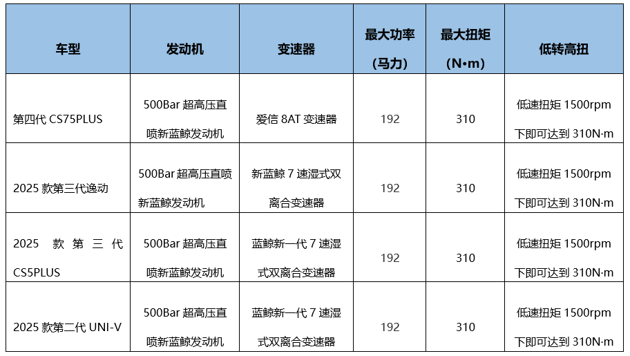在500Bar超高壓直噴新藍鯨發動機的賦能下,此次新推出的2025款第三代逸動、2025款第三代CS5PLUS、2025款第二代UNI-V等三款新車,均擁有最大功率141kW,最高扭矩310Nm的澎湃性能輸出,可與一些車型的2.5L自然吸氣發動機相媲美,給用戶帶來更為強勁的動力體驗。不僅如此,500Bar超高壓直噴新藍鯨發動機在1500轉時,就能輸出310N·m的最大扭矩,使車輛在起步和加速時,更加有力! 而1500-4000轉的峰值扭矩轉速區間,意味著用戶在日常使用的轉速范圍內,都能享受到源源不斷的酣暢動力!