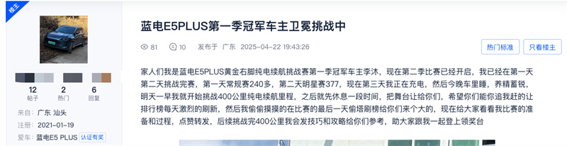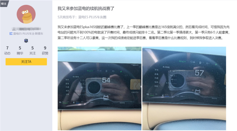 第二季續航挑戰賽反響熱烈,車友們都想跑出好成績。來自廣東的吳先生表示:“我又來參加藍電E5 PLUS 165km續航的巔峰賽比賽了,上一季的巔峰賽比最終成績只能排十二名。第二季比第一季搞得更大,第一季只有6個人能拿黃金,第二季聽說有十二人可以拿黃金,這一次我的成績肯定能進季后賽,看看季后賽是什么比賽規則,到時候我爭取進入決賽。”