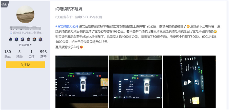 當然,除了純電續航優勢之外,后期用車成本也至關重要。也是一位參賽者宋先生表示:“他購買的藍電E5 PLUS純電續航是165km,通過這次比賽跑出了比官方還長的續航里程,半年時間總共跑了4000km多,期間就加了300塊錢的油,剩下花的都是電費,相當于每公里只耗費0.15元。”說明藍電E5 PLUS不僅續航能跑,在用車成本上還很省,這對消費者本身而言就是最真實的寫照。