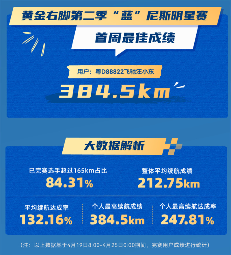 3月,藍電舉辦了藍電E5 PLUS 165km黃金右腳純電續航挑戰賽第一季,100名藍電車主同臺競技,成績斐然。參賽用戶成績超過165km占比80.21%,整體平均續航達成率115.54%,而在明星賽中,只以續航論英雄,個人最高續航成績368.5km,續航達成率高達237.04%。