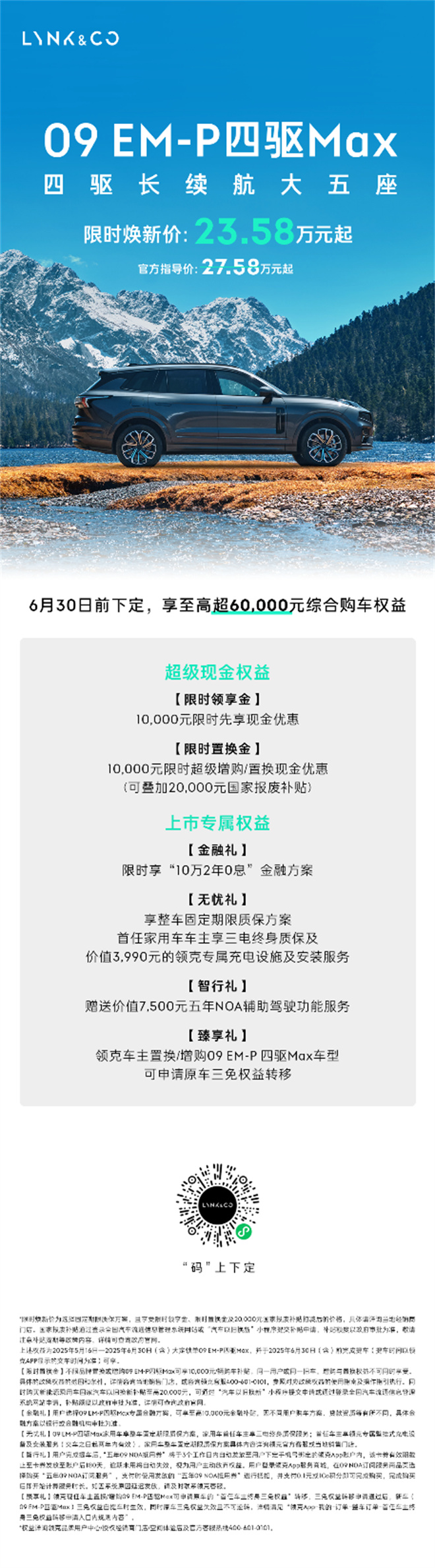 領(lǐng)克09 EM-P四驅(qū)Max大五座,不僅滿足當(dāng)代年輕用戶對(duì)大五座插混SUV多樣化出行的需求,更是送上六重福利。用戶在6月30日前下定享至高超60000元綜合購(gòu)車權(quán)益,包括10000元限時(shí)領(lǐng)享金、10000元限時(shí)超級(jí)增購(gòu)/置換現(xiàn)金優(yōu)惠(可疊加20000元國(guó)家報(bào)廢補(bǔ)貼)、“10萬2年0息”限時(shí)金融方案、價(jià)值7500元五年NOA輔助駕駛功能服務(wù)、整車固定期限質(zhì)保方案、首任家用車車主享三電終身質(zhì)保及價(jià)值3990元的領(lǐng)克專屬充電設(shè)施及安裝服務(wù)。此外,領(lǐng)克車主置換/增購(gòu)09 EM-P四驅(qū)Max車型可申請(qǐng)?jiān)嚾鈾?quán)益轉(zhuǎn)移。多重福利加持,助力用戶輕松擁有全場(chǎng)景自由出行體驗(yàn)。