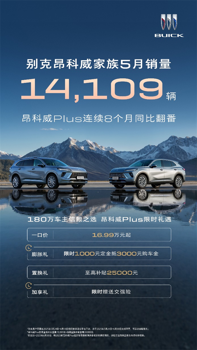 【2025年6月3日】 別克昂科威家族5月銷量出爐,月銷量14,109輛,昂科威Plus也實現連續8個月同比翻番。