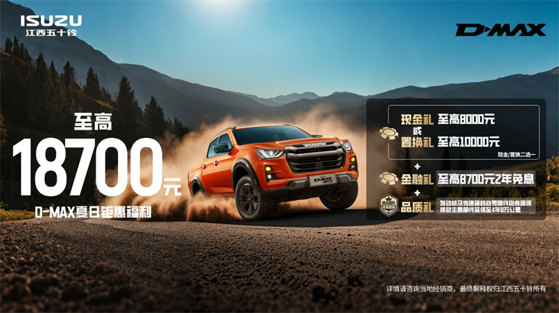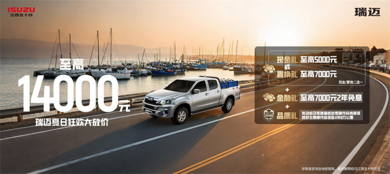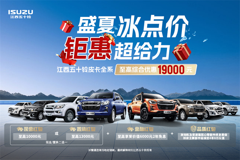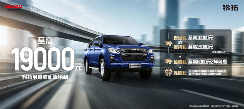 江西五十鈴盛夏放“價”!D-MAX、鈴拓、瑞邁三款明星皮卡聯手鉅惠,現金紅包、置換紅包、金融貼息、品質禮,多重豪禮疊加至高優惠19000元!省下的真金白銀,就是您的旅游基金、創業本金、家庭小金庫!