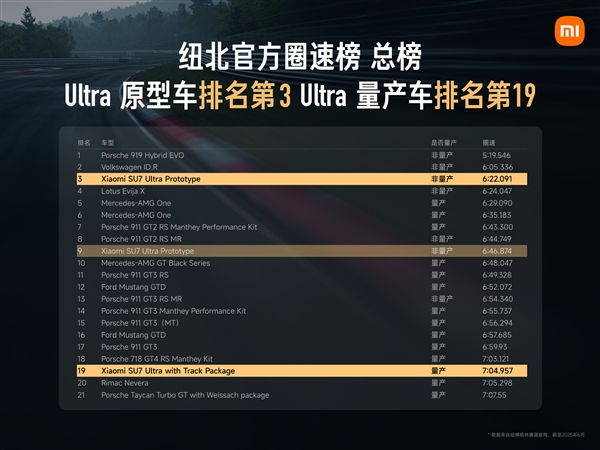 上個(gè)月,小米SU7 Ultra量產(chǎn)版首次征戰(zhàn)紐博格林北環(huán)(下文簡(jiǎn)稱為“紐北”)賽道,以7分04秒957,刷新紐北量產(chǎn)電動(dòng)車圈速記錄,成為紐北史上最速量產(chǎn)電動(dòng)車。而后,SU7 Ultra原型車又跑出了6分22秒091的成績(jī),位列紐北圈速總榜全球第三。