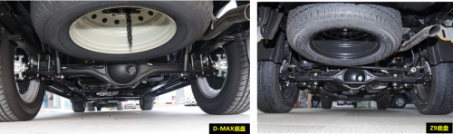 后橋減震器:D-MAX采用的是八字形斜向減震器,緩沖行程更長,能更好地抑制過彎時的車身搖擺,過彎更穩當,后排乘客也不容易暈車。Z9采用的是平行垂直布局,遇到顛簸時減震動作比較"直來直去",過濾震動不夠細膩。