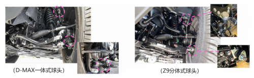 前懸架球頭:皮卡前懸架球頭屬于易損件,Z9采用的一體式球頭一旦出問題得換整個控制臂,成本高,修起來麻煩。D-MAX則采用分體式球頭(螺接工藝 + 鍍彩鋅防銹處理),磨損后僅需更換單個部件,可顯著降低維修成本,享受更省心的用車體驗。