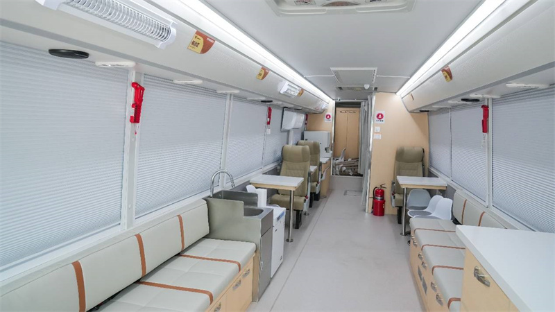 BJ5160XYL采用多功能空間設(shè)計(jì),充分體現(xiàn)了人性化的設(shè)計(jì)理念。從駕駛區(qū)到診療區(qū),每一處細(xì)節(jié)都經(jīng)過(guò)精心規(guī)劃:駕駛區(qū)配備智能輔助系統(tǒng),減輕駕駛員疲勞;等候區(qū)設(shè)有長(zhǎng)條沙發(fā)、飲水機(jī)、洗手池等設(shè)施,為患者提供舒適環(huán)境;診療區(qū)配備血液細(xì)胞分析儀,可進(jìn)行初步檢查與抽血;檢驗(yàn)區(qū)配備多功能檢查床和化驗(yàn)桌,支持彩色多普勒超聲、12導(dǎo)聯(lián)心電圖等檢查;車輛尾部還設(shè)有休息區(qū),方便醫(yī)護(hù)人員換衣與儲(chǔ)存物品。