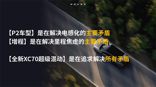 這大概是汽車圈最優(yōu)雅、正向的技術(shù)diss了。“【P2車型】是在解決電感化的主要矛盾”,多少有點“半成品”的嫌疑:“【增程】是在解決里程焦慮的主要矛看”,明顯是位偏科生;而【全新XC70超級混動】是瑞士軍刀,“在追求解決所有矛盾”。