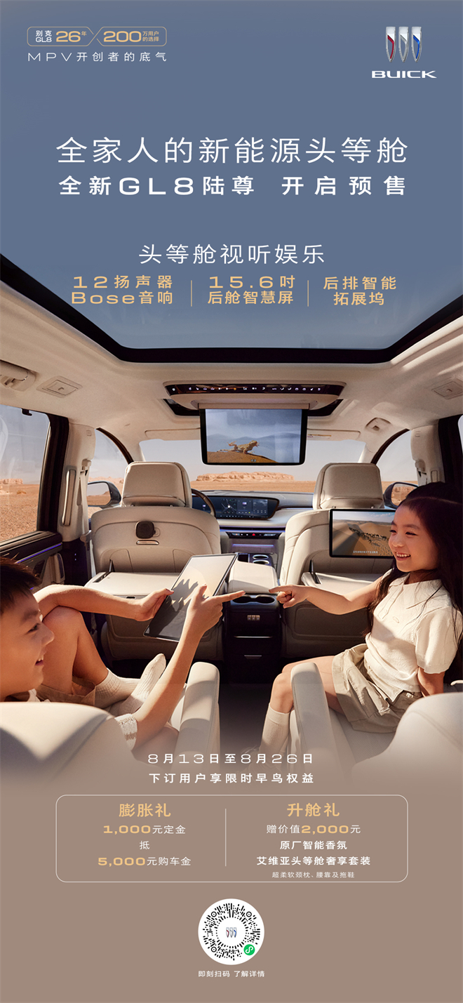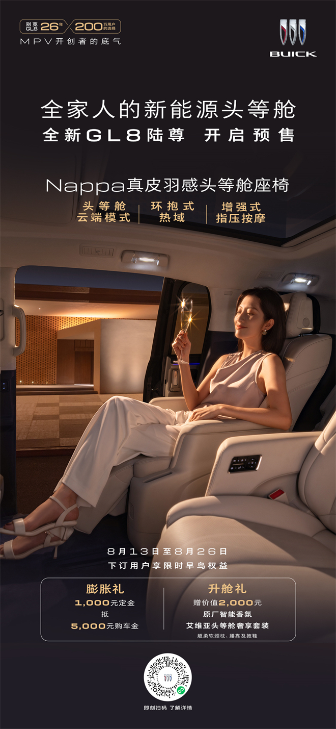2025年8月13日 今天,別克品牌宣布:豪華新能源MPV——全新GL8陸尊正式開啟預售。新車共推出智享版、尊享版、奢享版三款配置車型,全系均為艾維亞豪華版本;同時提供紫氣東來、極光銀、珍珠白三款車身色,以及霞紫月白、霞灰月黛兩款內飾色供選擇。即日起,用戶可通過別克官網、iBuick App、別克微信小程序或別克經銷商店等渠道下單預訂全新GL8陸尊,凡在8月13日-8月26日預售期間下訂的用戶,可享限時早鳥權益:膨脹禮1000元定金抵5000元購車金;價值2000元升艙禮,包含艾維亞頭等艙奢享套裝及原廠智能香氛。目前,全新GL8陸尊已經全面到達全國別克授權經銷商門店,歡迎消費者到店體驗。