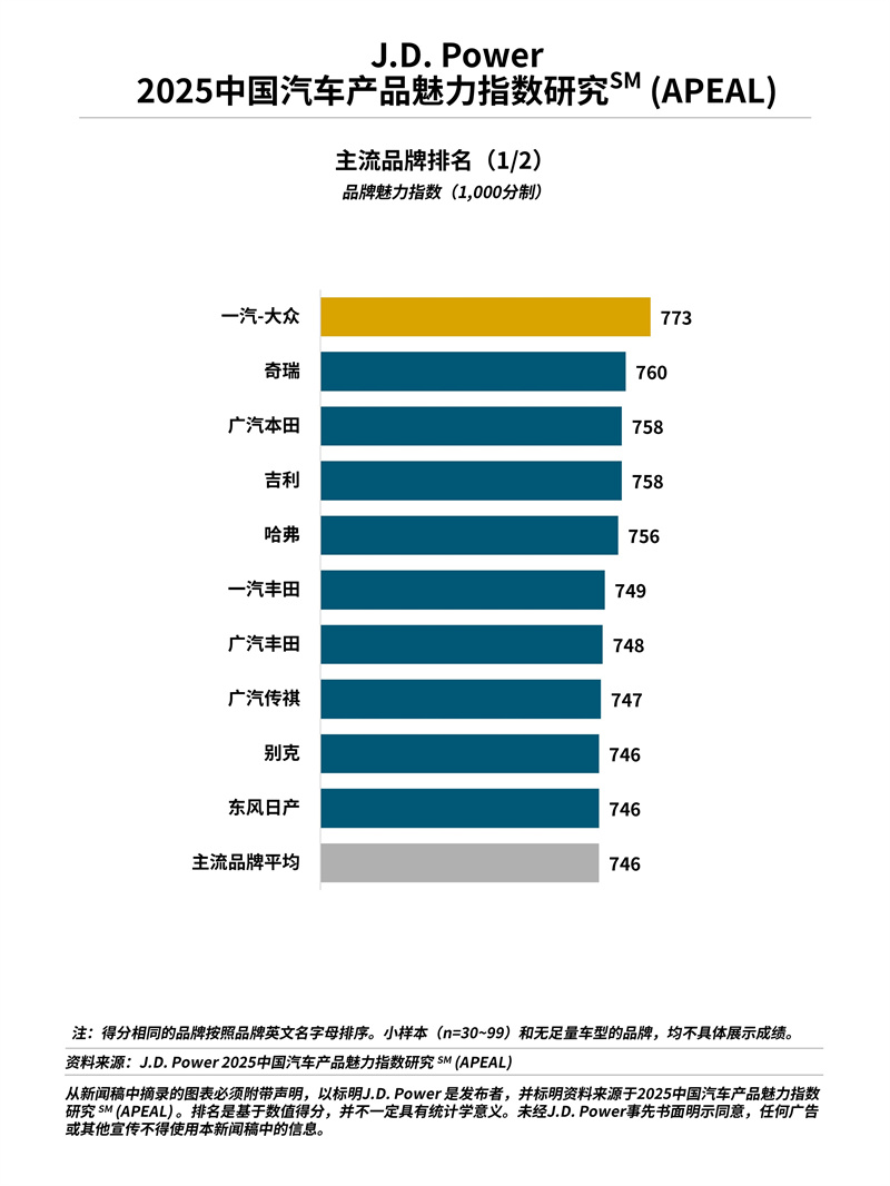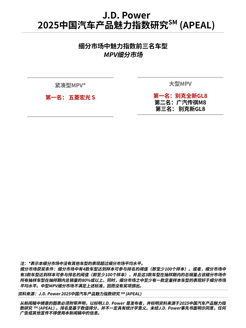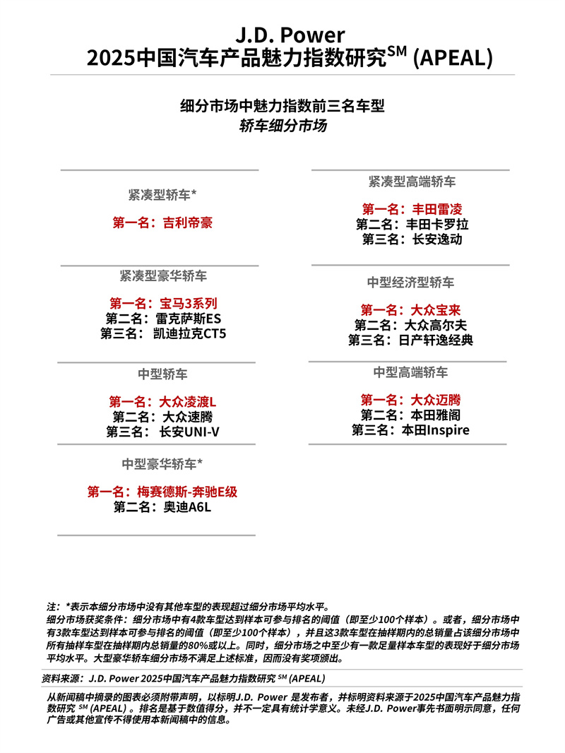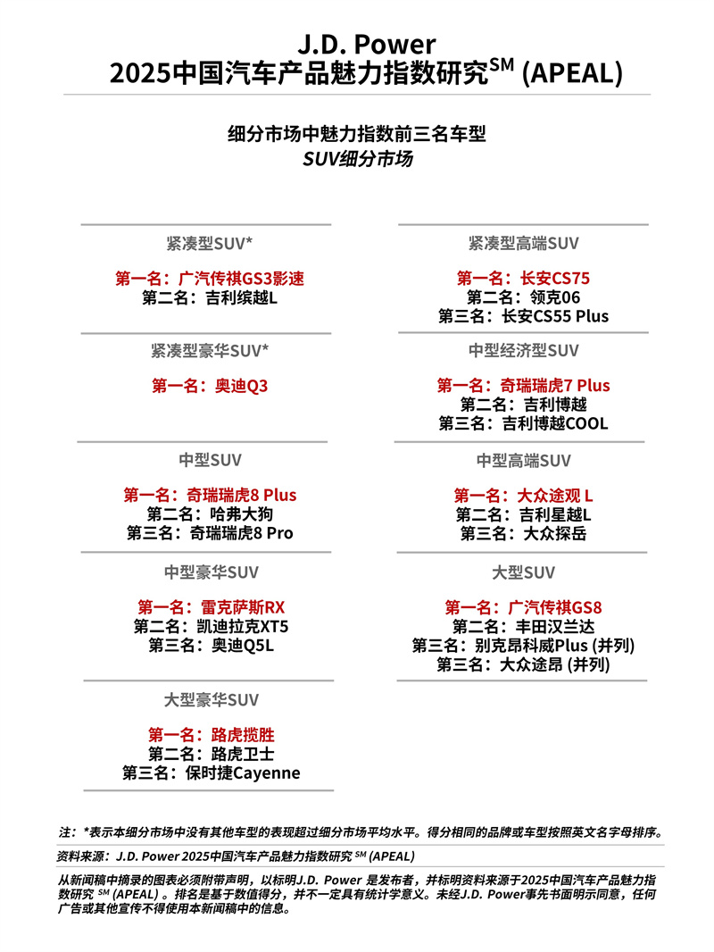 2025年8月14日,上海 — 全球領(lǐng)先的消費(fèi)者洞察與市場(chǎng)研究機(jī)構(gòu)J.D. Power|君迪今日正式發(fā)布2025中國(guó)汽車(chē)產(chǎn)品魅力指數(shù)研究SM(APEAL),這是J.D. Power連續(xù)第23年發(fā)布這一研究。該研究衡量了燃油車(chē)新車(chē)車(chē)主在購(gòu)車(chē)2至6個(gè)月內(nèi)擁有和駕駛車(chē)輛的各方面體驗(yàn),從而最終整合出讓新車(chē)購(gòu)買(mǎi)者感到興奮和欣喜的車(chē)輛要素設(shè)計(jì)組合,是汽車(chē)廠(chǎng)商設(shè)計(jì)和開(kāi)發(fā)車(chē)輛的重要依據(jù)。