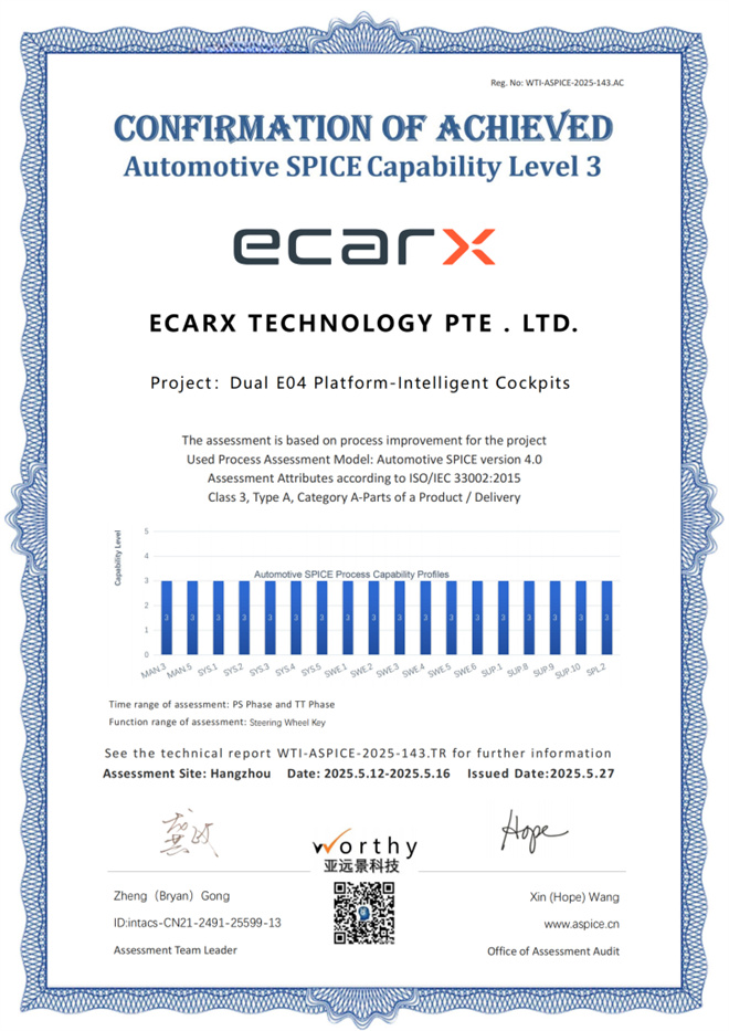 ASPICE證書是汽車行業軟件開發領域的國際權威認證,用于評價軟件開發團隊的研發能力與體系化水平,也是國際標準化組織(ISO)和國際電工委員會(IEC)的聯合標準之一。Capability Level 3(CL3)是目前全球汽車行業在ASPICE認證上獲得過的最高評級,這標志著億咖通科技在開發、質量管理和流程體系建設方面已完全達到國際領先水平。